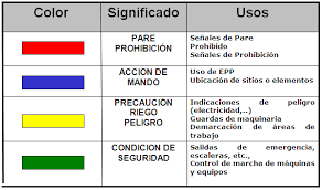 La aplicación de los colores de seguridad se hace directamente sobre los objetos, partes de edificios, elementos de máquinas, equipos o dispositivos, los colores aplicables son los siguientes: