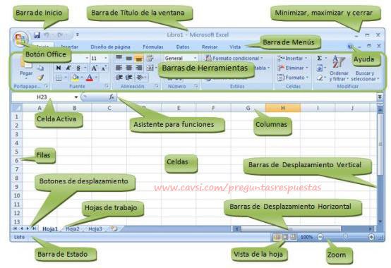 15. Barra de estado. Muestra los mensajes que corresponden a lo que se está realizando. En este caso aparece listo, lo cual indica que el programa está preparado para que el usuario elija un comando o escriba datos en una celda. Además informa sobre el estado de las teclas de bloqueo de mayúsculas, bloqueo de números, etc.