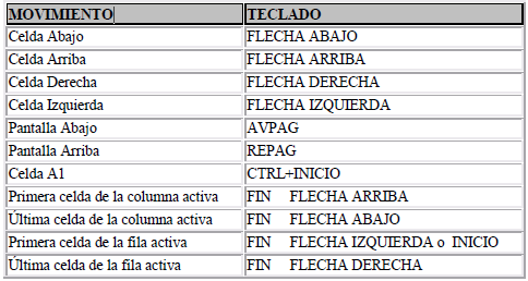 - Ctrl+Tecla dirección Moverse al extremo de la fila o columna actual de acuerdo a la tecla de dirección pulsada.